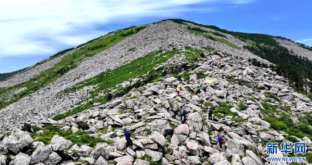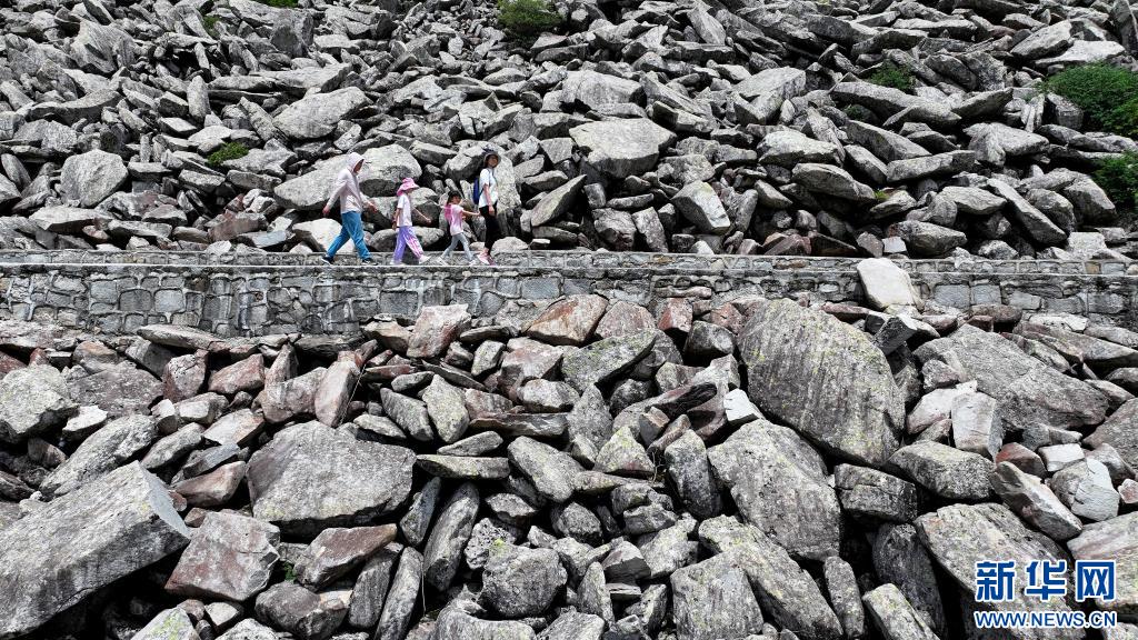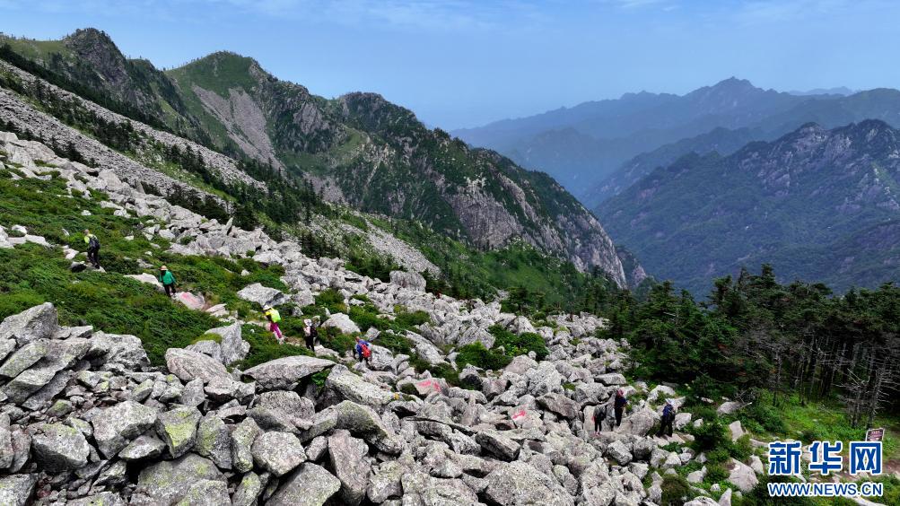 游人經(jīng)過陜西朱雀國(guó)家森林公園內(nèi)的石海(7月21日攝,無(wú)人機(jī)照片)。公園內(nèi)的大面積石海,是典型的冰川侵蝕地貌,也是秦嶺地區(qū)冰川遺跡的代表。