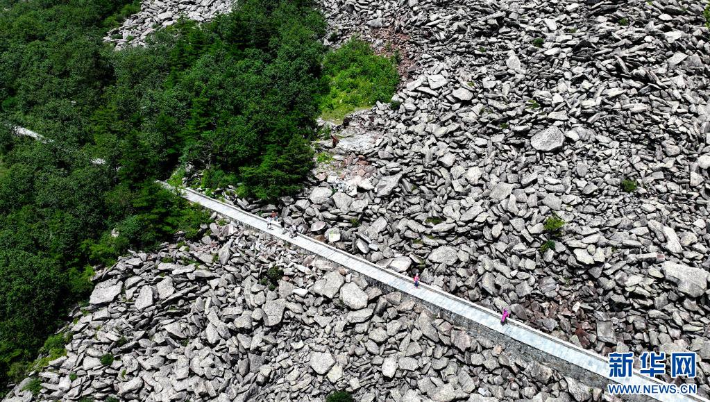 游人經(jīng)過陜西朱雀國(guó)家森林公園內(nèi)的石海(7月21日攝,無(wú)人機(jī)照片)。