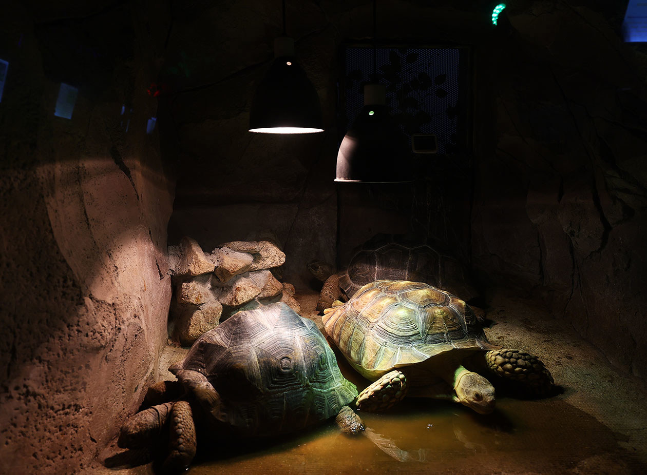 兩棲爬行類動物們也享受著各種保暖措施帶來的溫暖。一進館內(nèi),一股潮熱的空氣撲面而來。黃金蟒、網(wǎng)紋蟒、蜥蜴……它們居住的籠舍里,溫度計分別顯示為25℃。除了有地暖之外,還可以享受到浴霸帶來的溫暖。