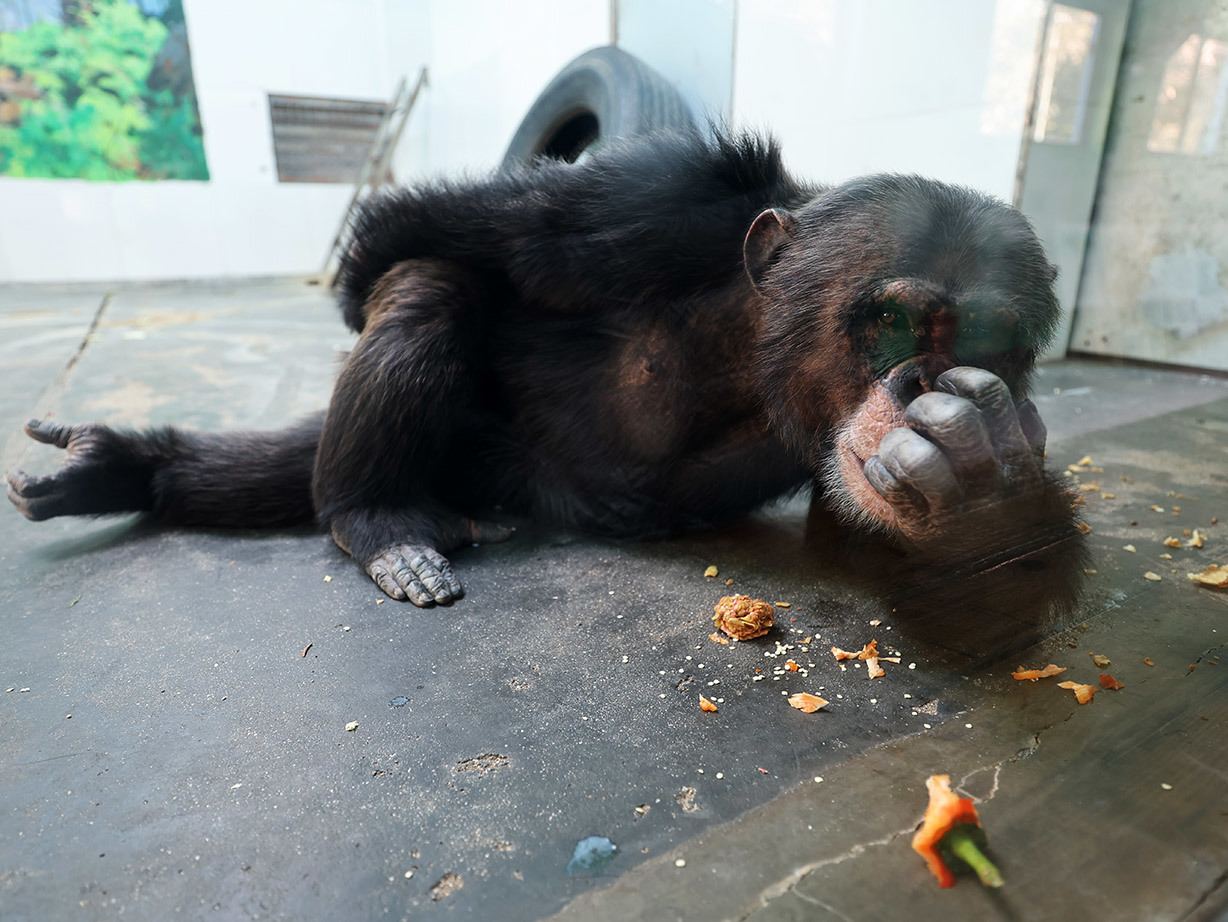 館舍里,明星動物黑猩猩“多多”和它的“新婚妻子”珍妮,安逸地躺在地上,四肢舒展。見到有游客來了,鏡頭感極強的多多便拿起一個紅色的甜辣椒,津津有味地吃起來。夏天記者前來采訪時,多多喝的是綠豆湯,這次啃食辣椒,是不是和動物過冬有關(guān)?