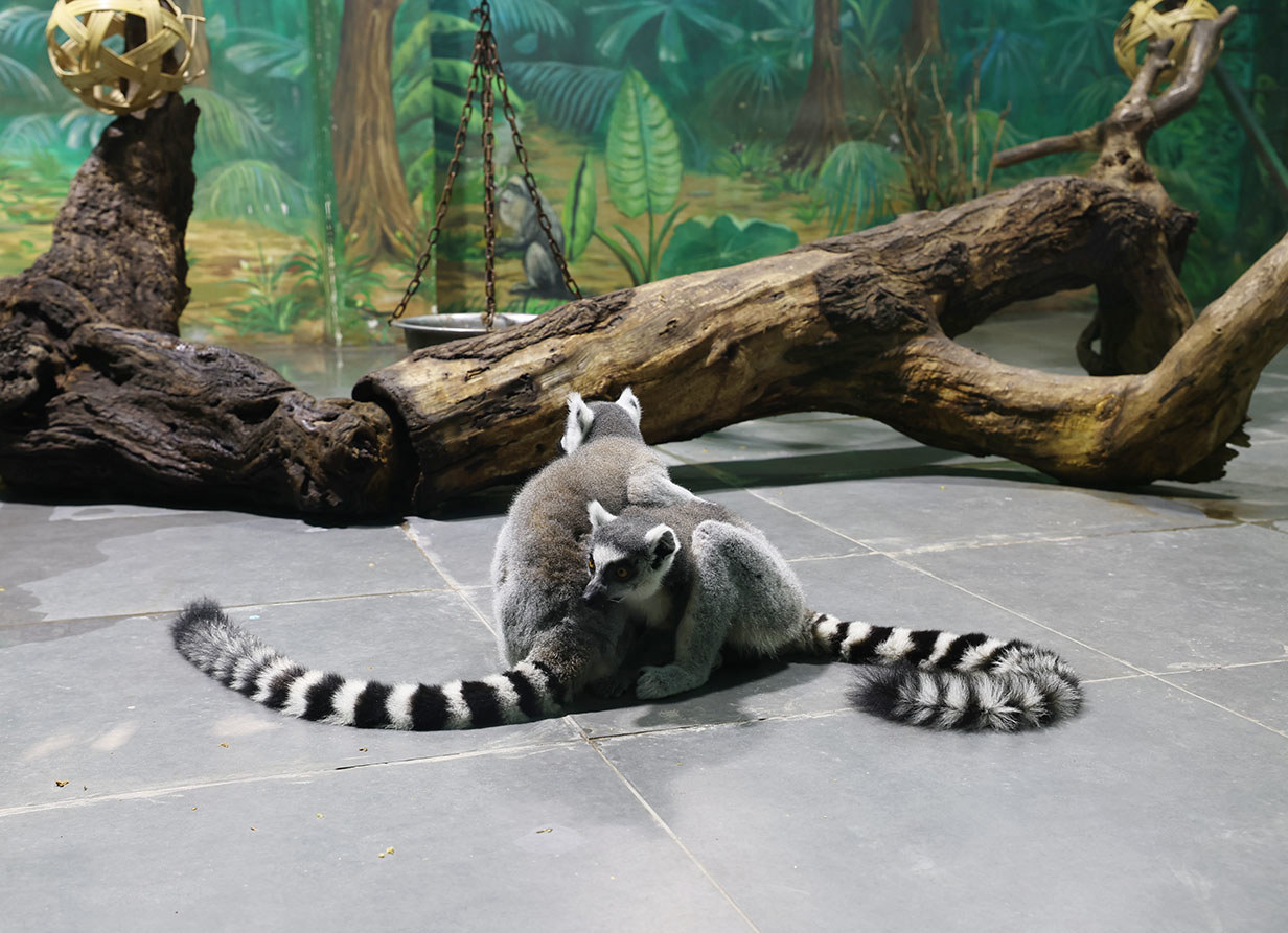 動物管理部猴苑班長李艷玲介紹,為了讓環(huán)尾狐猴生活得更加快樂,他們將室外的豐容設(shè)施搬到了室內(nèi),取食器、輪胎、竹子編制的小球等,最大限度地還原它們在室外的生存環(huán)境。除了環(huán)境豐容,冬天里,飼養(yǎng)員們也會制造一些食物豐容,比如將食物藏在葉子下面,讓動物們邊吃邊玩。