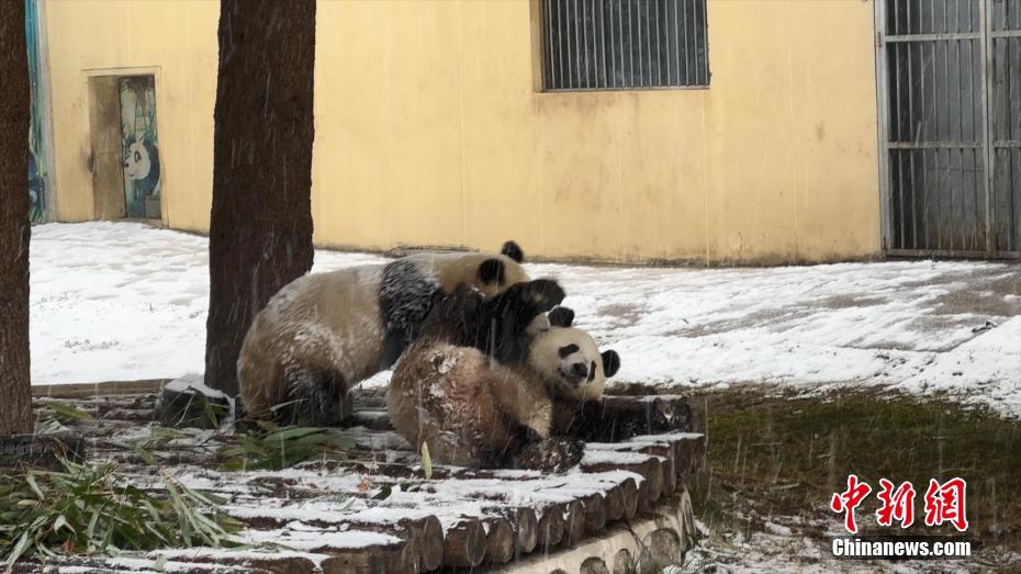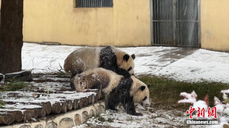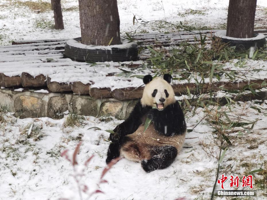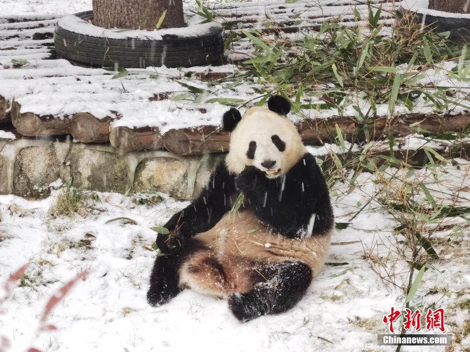 1月16日,陜西西安再次降雪。漫天飛舞的鵝毛大雪,令秦嶺野生動(dòng)物園里的“國(guó)寶”大熊貓顯得尤為興奮,不僅在雪地里玩耍,連吃竹子都不愿離開片刻。圖為秦嶺野生動(dòng)物園里的大熊貓冒雪吃竹子。