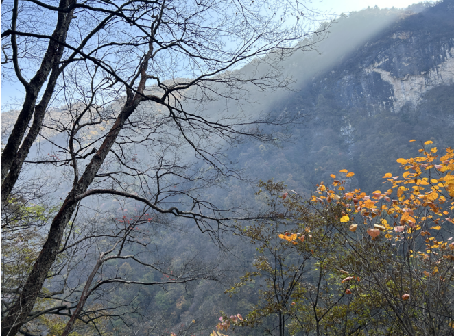 植被因常年處于濕潤(rùn)的霧氣環(huán)繞之中,在秋末冬初,霧氣與紅葉相互交融,山巒的叢林被洗滌得蔥蘢翠綠、斑斕多彩,增添了一份神秘的氛圍,讓人仿佛置身于仙境之中。