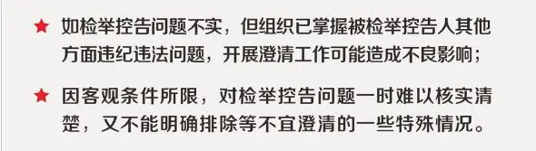 《辦法》也同時規(guī)定了一些不予澄清的情形。如檢舉控告問題不實,但組織已掌握被檢舉控告人其他方面違紀(jì)違法問題,開展澄清工作可能造成不良影響;因客觀條件所限,對檢舉控告問題一時難以核實清楚,又不能明確排除等不宜澄清的一些特殊情況。