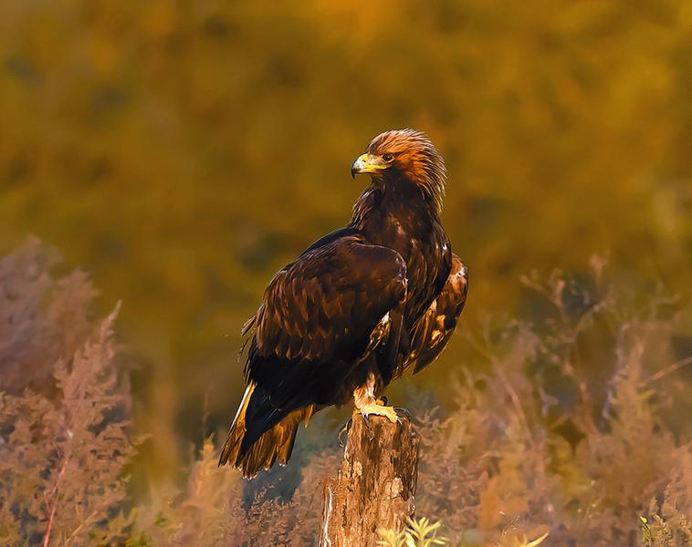 金雕的“金”,主要是指它頭和頸后羽毛在陽光照耀下反射出的金屬光澤,它全身的羽毛呈栗褐色,背部和翅膀上還雜以少量白色,跟金色相距甚遠(yuǎn)。