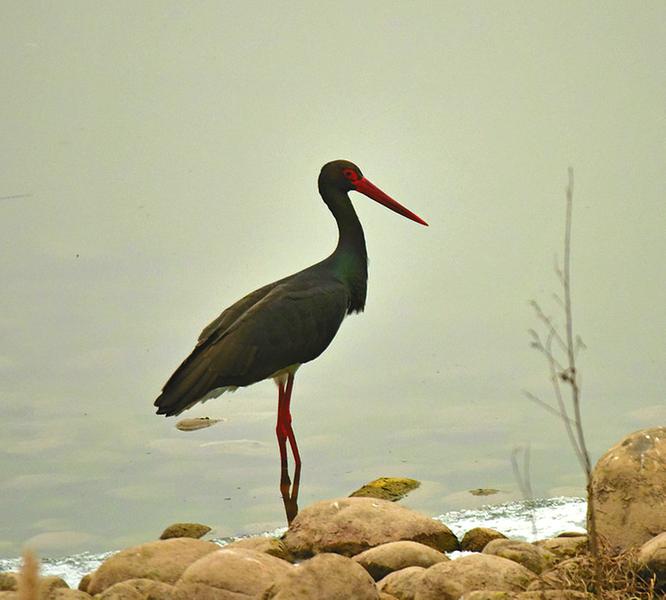 黑鸛屬于國(guó)家Ⅰ級(jí)重點(diǎn)保護(hù)野生動(dòng)物,隸屬于鳥綱鸛形目鸛科,大型涉禽,體長(zhǎng)可達(dá)100厘米。其下胸、腹部及尾下為白色,其余部分為黑色,在陽光的照射下黑色部位會(huì)散發(fā)綠色和紫色的金屬光澤,嘴及腿為紅色,飛行時(shí)翼下為黑色,眼周裸露皮膚為紅色。主要以各種魚、蝦和水生昆蟲為食。